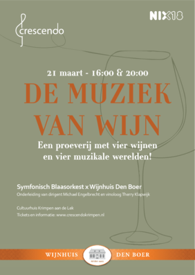 Tickets verkrijgbaar online via ⇒ https://www.crescendokrimpen.nl/de-muziek-van-wijn/