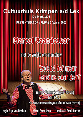 Marcel Vaandrager komt, na Rotterdam, Den Haag en uitverkochte zalen in Brabant, op vrijdag 6 februari naar Het Cultuurhuis in Krimpen a/d Lek met de voorstelling ‘Zolang het maar nergens over gaat!’